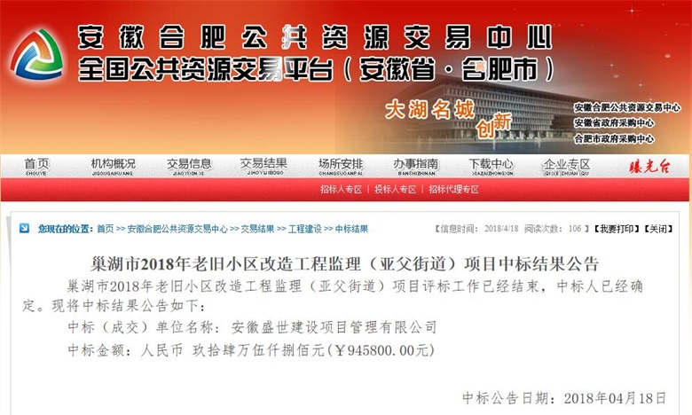 热烈祝贺我司中标巢湖项目 来源:安徽盛世建设项目管理有限公司 发布日期:2018-04-18 浏览次数:2029 上一篇:关于开展年后复工及二〇一八年一季度的检查通知 下一篇: 热烈祝贺我公司荣获2017年度合肥市建筑业优秀企业